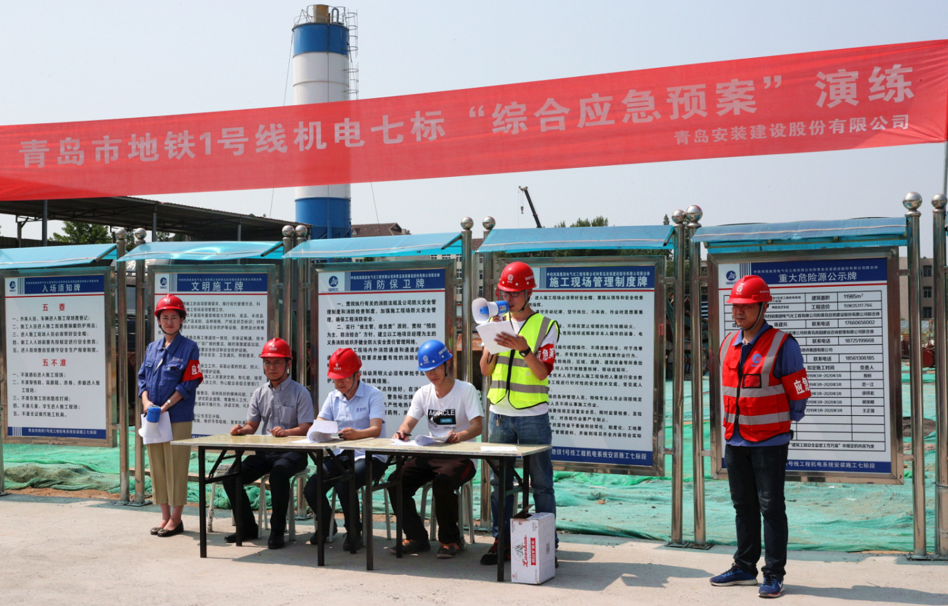 為扎實開展2019年“安全生產月”活動,牢固樹立“生命至上,安全生產”理念,全面提升安全生產事故應急救援處置能力,2019年6月14日下午,我公司聯合中鐵四局地鐵項目部在青島市地鐵1號線工程機電系統施工七標段遵義路站站區開展了一次以“防風險 除隱患 遏事故”為主題的安全生產事故應急救援綜合演練活動,公司黨委書記、常務副總經理張衛財出席活動,安環部主任馬世革、中鐵四局、監理公司、各分公司負責安全生產的副經理、專職安全員及安環部全體人員共計80余人到現場觀摩演練。中鐵四局青島地鐵1號線機電七標項目經理劉洋擔任演練總指揮。公司商務經理姜曉紅擔任主持人。
