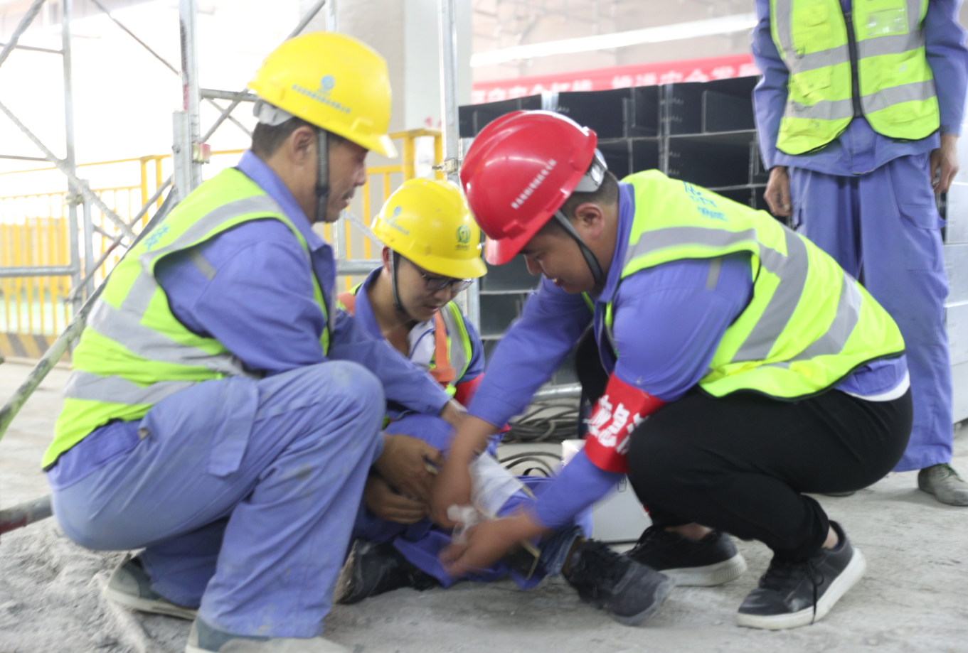 下午2點整,姜曉紅經理講解了應急演練的積極意義及具體方案,公司地鐵項目部安全總監王正強講解滅火器材使用方法和消防疏散注意事項及安全帶的正確使用方法,并現場隨機邀請了兩名工人進行滅火器的使用演練。2點20分,綜合應急救援演練活動總指揮劉洋同志宣布演練正式開始,演練背景:1、由于夏季多雨,車站發生雨水倒灌;2、施工現場電焊作業的焊渣引燃可燃材料導致火災。隨即展開防汛、消防救援活動,經過水泵排水、砂袋擋水、自救互救、滅后器滅后、消防水滅火、人員疏散逃生、火勢得到控制,險情被成功化解。演練主要展現現場應急響應、防汛、滅火、人員疏散逃生、傷員急救轉移五個環節,分應急響應、信息上報、防汛、滅火器滅火、消防水滅火、傷員救治與轉移、人員疏散七個場景演練,鍛煉搶險救援隊伍,提高先期處置能力。